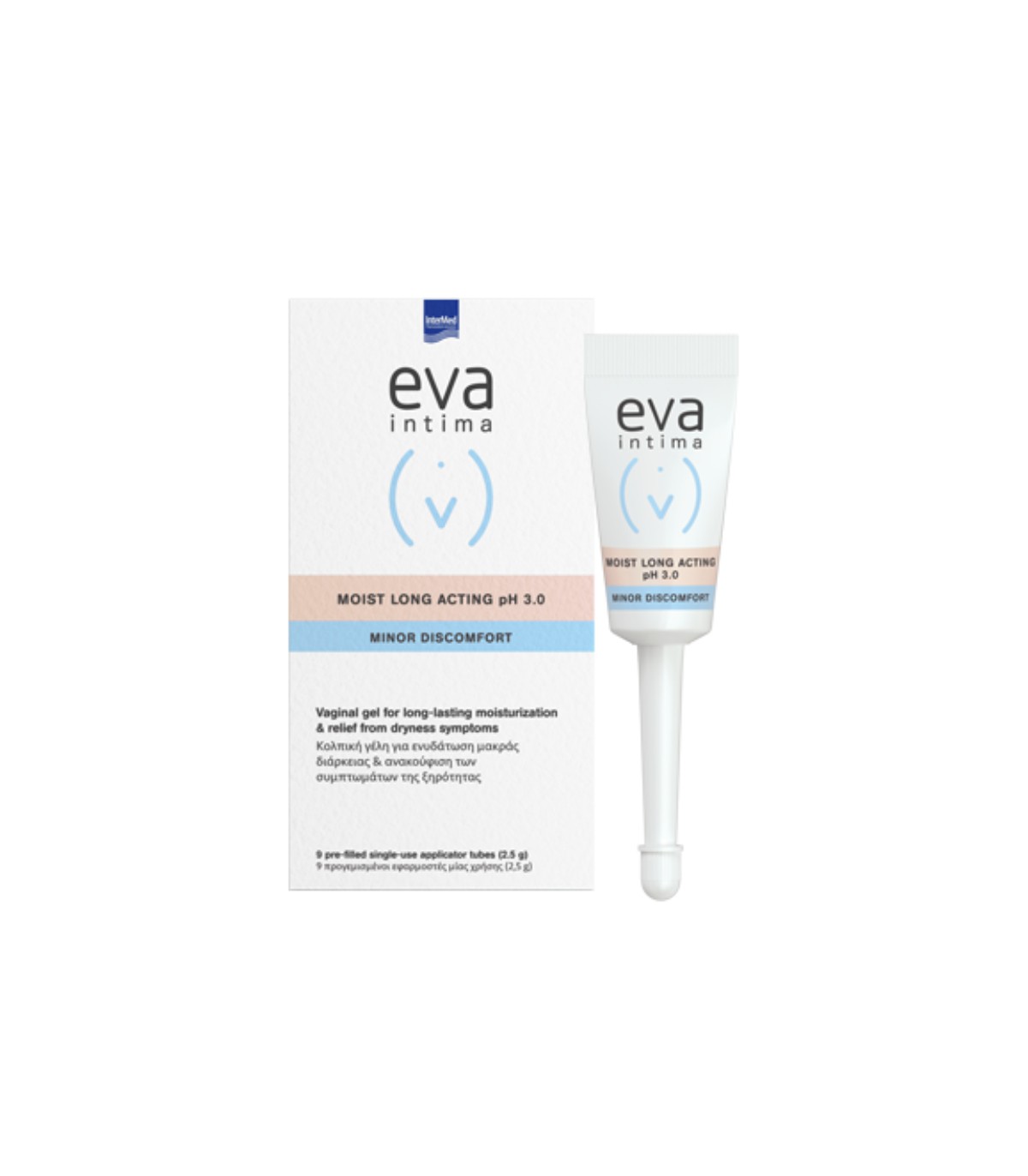 Το Eva Intima Moist Long Acting Gel είναι υγραντική κολπική γέλη εμπλουτισμένη με υαλουρονικό οξύ, για την άμεση επαναφορά και μακροχρόνια διατήρηση της φυσιολογικής υγρασίας του κόλπου σε περιπτώσεις ξηρότητας, ανακουφίζοντας ταυτόχρονα από τα συμπτώματα που τη συνοδεύουν όπως ο κνησμός, ο καύσος και ο ερεθισμός. Παράλληλα ενισχύει και επιταχύνει την επουλωτική & αναπλαστική ικανότητα του κολπικού βλεννογόνου σε περιπτώσεις που δημιουργούνται μικροαμυχές ή μικροτραυματισμοί. Συσκευασία: 9 προγεμισμένοι με γέλη κολπικοί εφαρμοστές μίας χρήσης