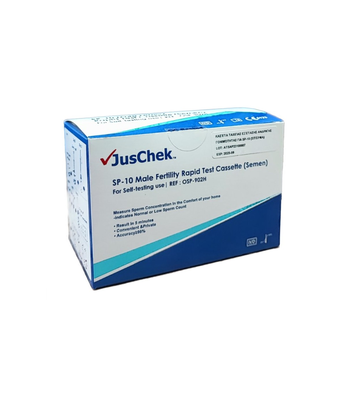 The JusChek SP-10 Male Fertility Rapid Test is a rapid chromatographic immunoassay test for the in vitro qualitative detection of SP-10 acrosomal protein found in semen to assess whether the sperm concentration is above or below 15 million/mL in human sperm.