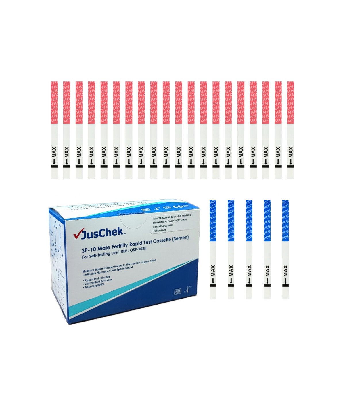 Combo JusChek SP-10 male fertility test, 20 LH ovulation and 5 hCG pregnancy HomeTest test strips.